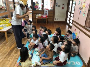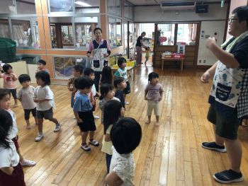 以前、異年齢交流で3歳児もも組さんと一緒にもも組の部屋で遊んで、ホールで表現遊びをしました。