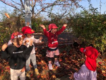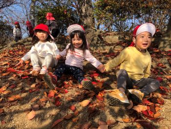 無事に到着!持ってきたおやつをみんなで、食べた後は、落ち葉であそんだよ🍂