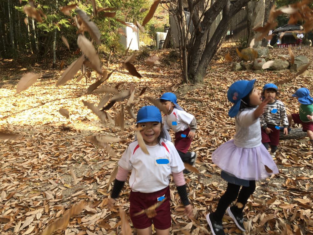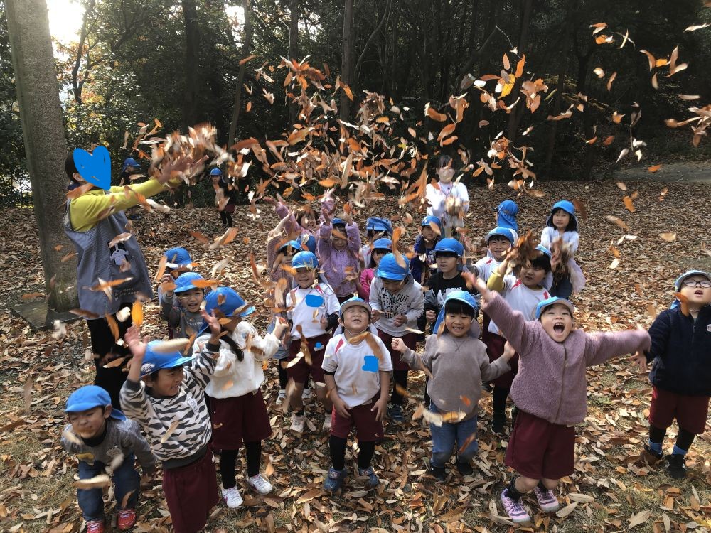 最後には葉っぱを集めて……「せーの!」の掛け声で落ち葉シャワーをしました🍂