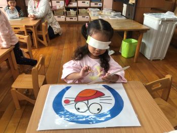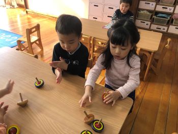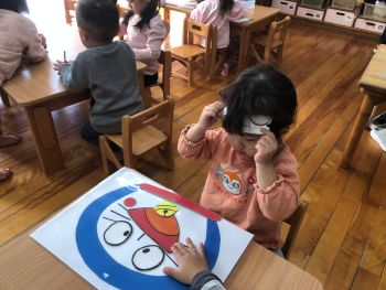 1月7日は、クラスでお正月遊びをしました。福笑いとコマをしました!