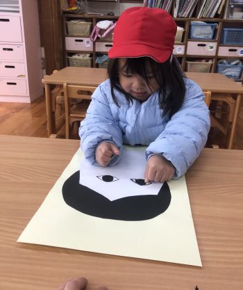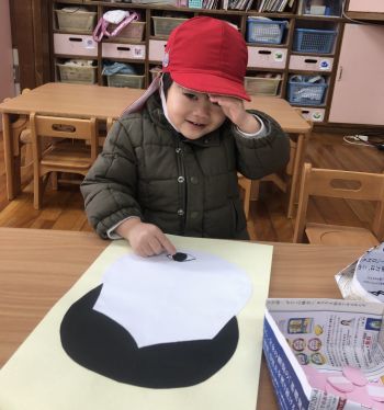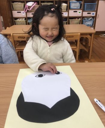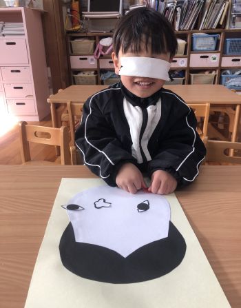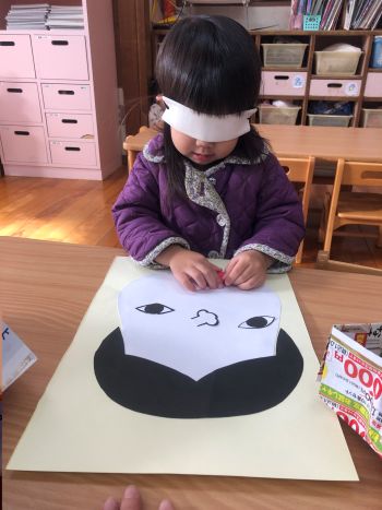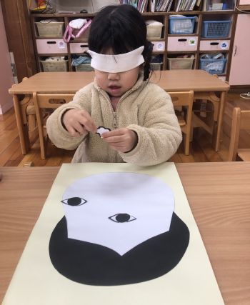目隠しをして、福笑いに挑戦しました。最初は、目隠しをする事にすこしドキドキ💗している様子もありましたが…。「先生、どんな顔になってるの~?」「変な顔になってる?」と先生に聞いていました。