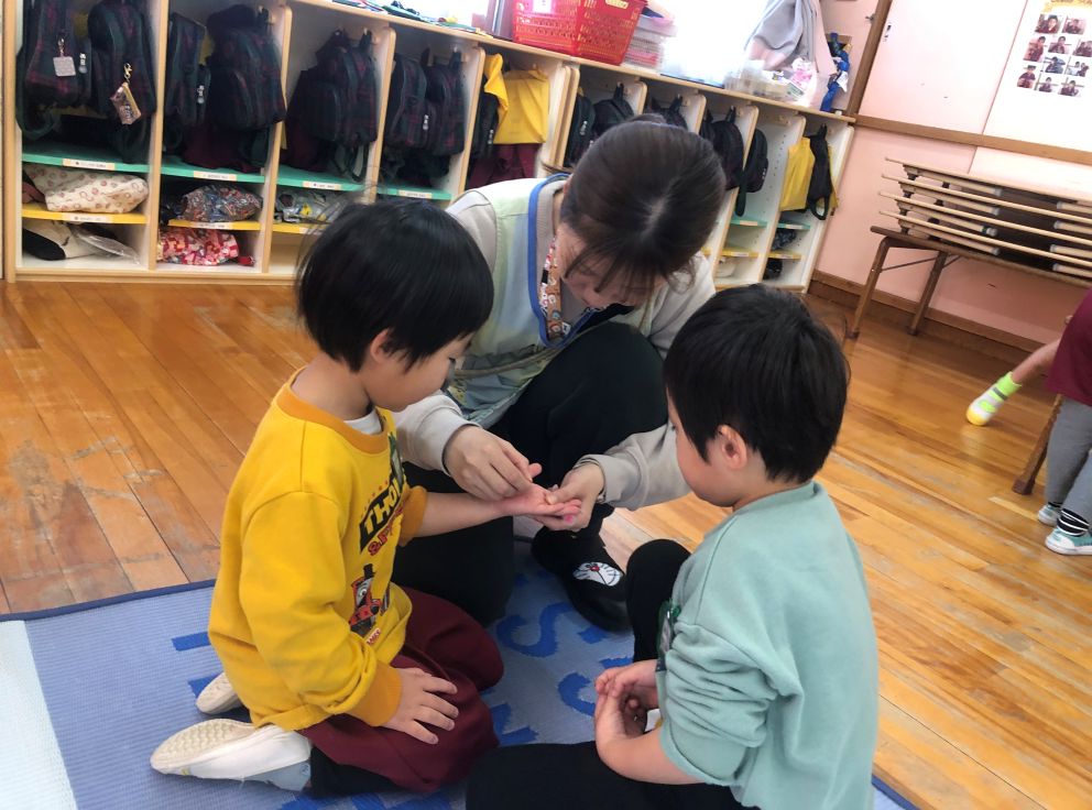 先日、みどり組さんは調理の先生から、手洗い指導をしてもらいました。