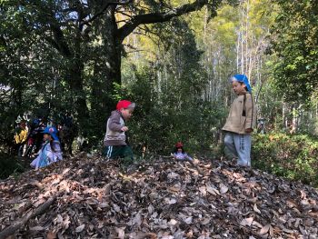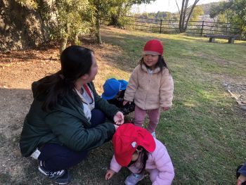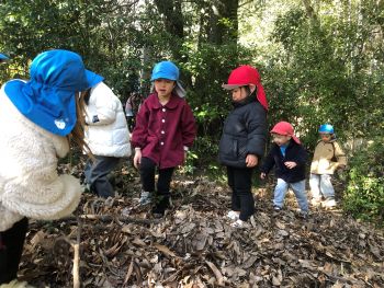 落ち葉の山があり、登ったり、落ち葉を頭の上から降らせたりと…冬なのに秋の自然物に触れました(笑)