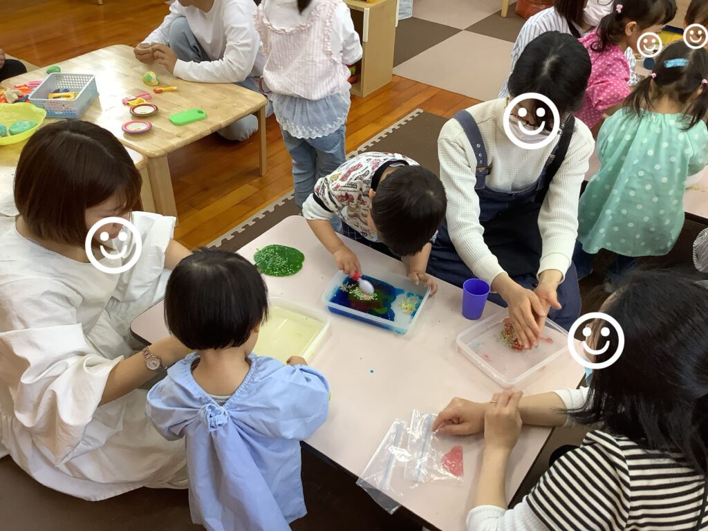 スライムとカラーライスを混ぜてみよ!と実験するお友だち♡