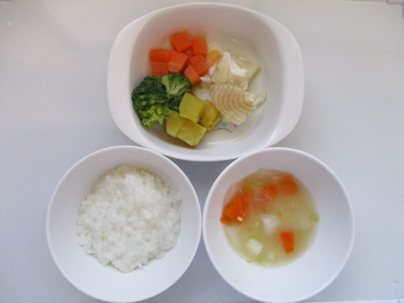 ・軟飯 ・白身魚と野菜 ・オニオンスープ