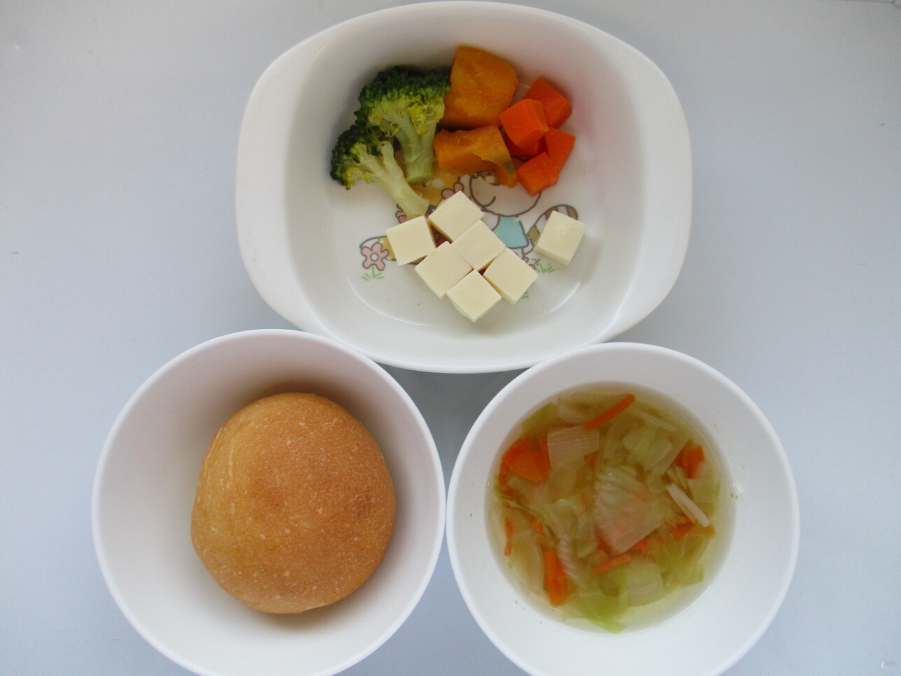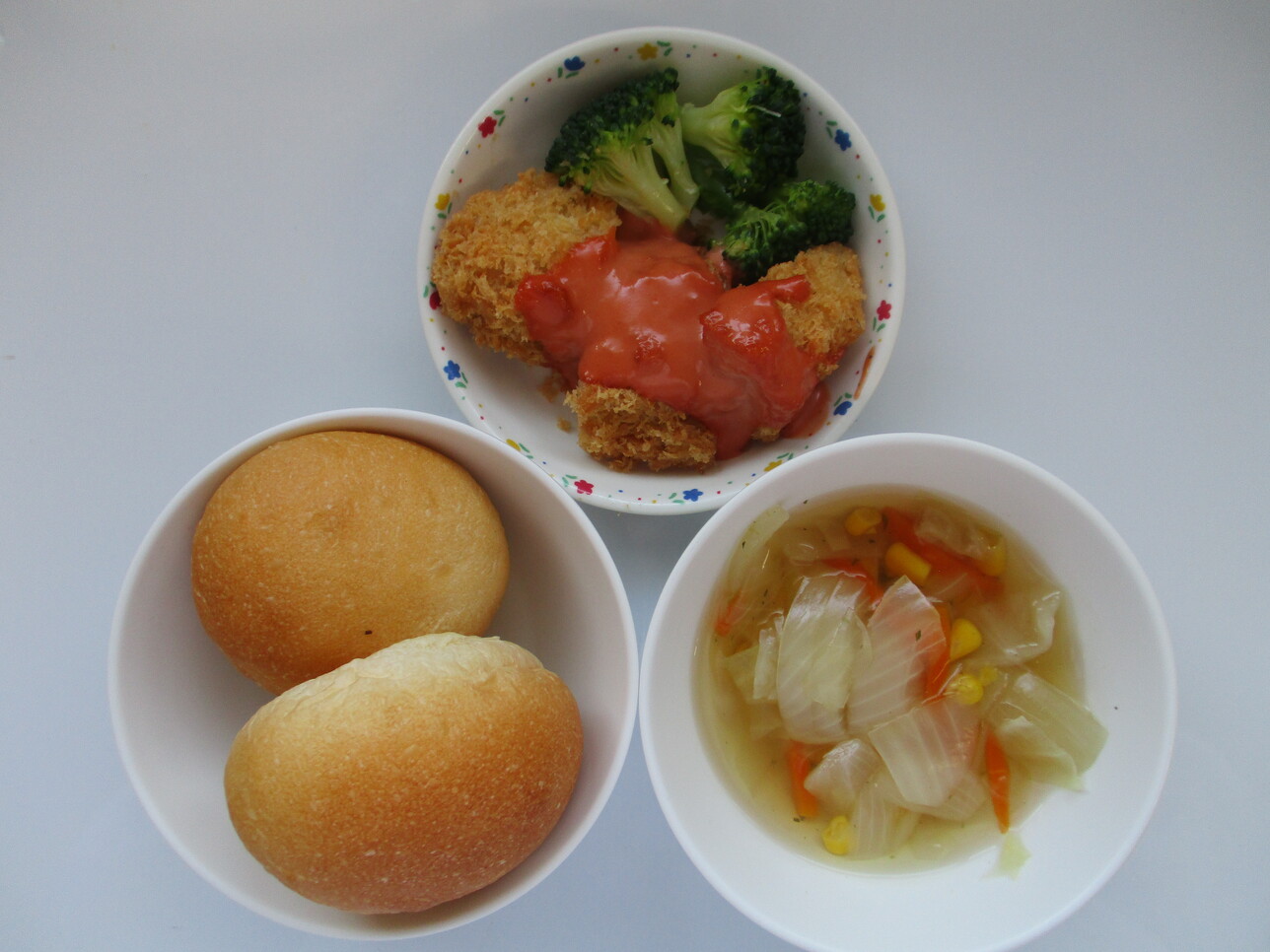 ・パン ・魚フライオーロラソース ・付け合せ ・野菜スープ