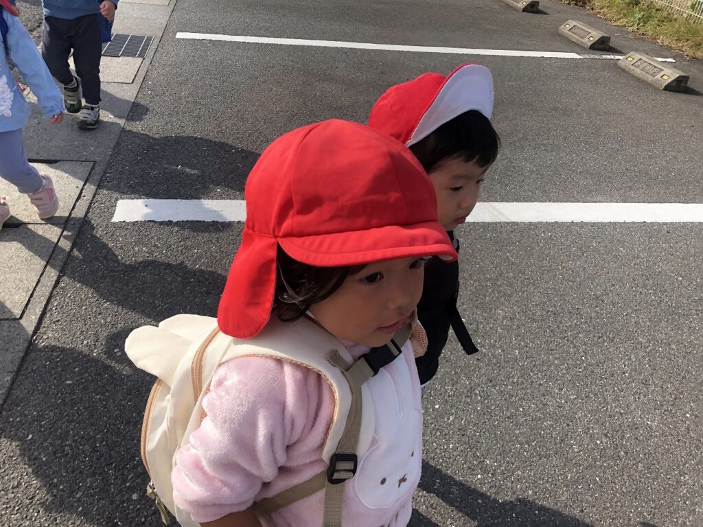 持ってきたお菓子を食べて遠足に出発!リュックを背負い、お友だちと手を繋いでいつもとは違うルートで鶴崎第二公園まで歩きました。