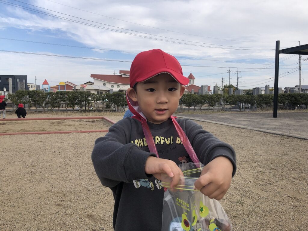 公園につくと保育者が隠したお宝探しやどんぐり、木の実などたくさん拾い、自分たちで作った散歩バックがいっぱいになり大満足でした。