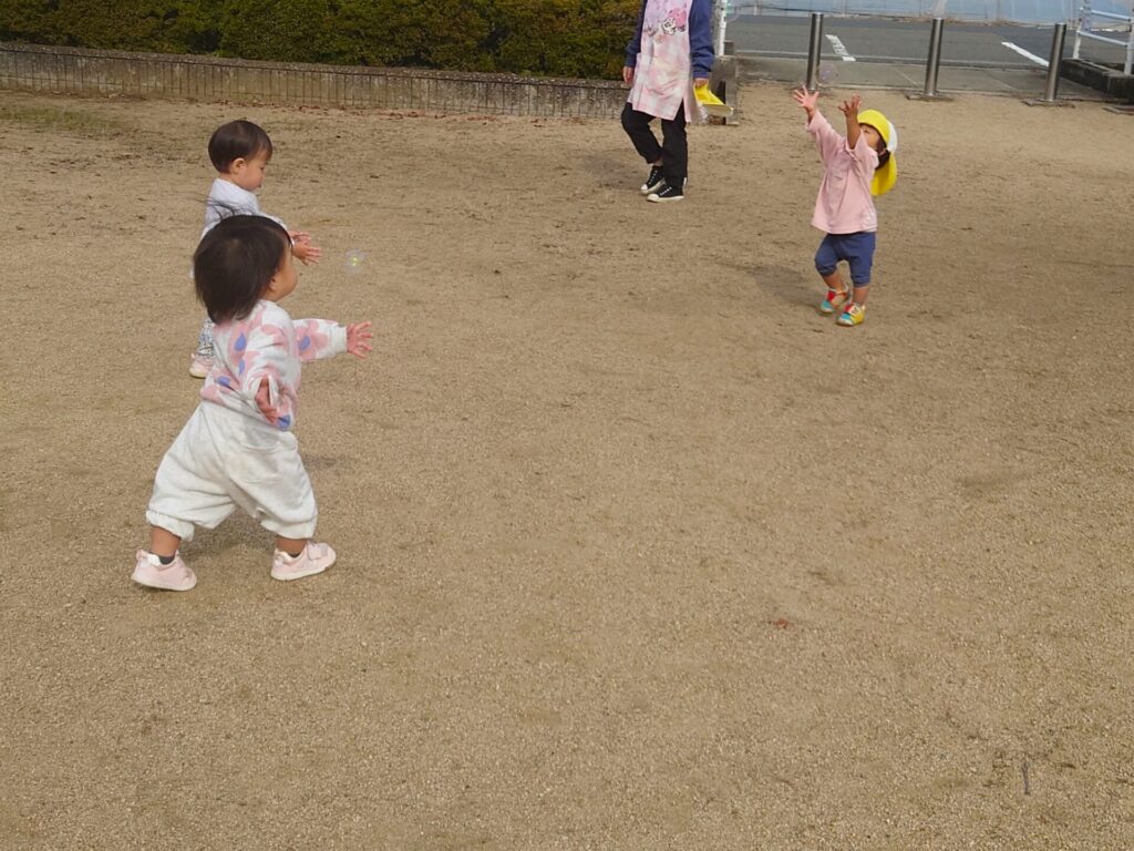 ふわふわと舞うシャボン玉に手を伸ばしたり、笑い声をあげたりと、楽しそうな様子が見られました♡
