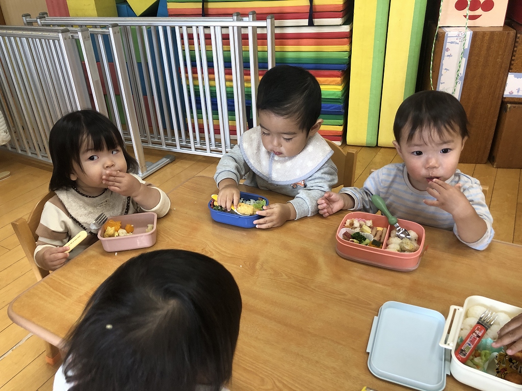 園に戻ってからは、ホールでお楽しみのお弁当タイム🍱
