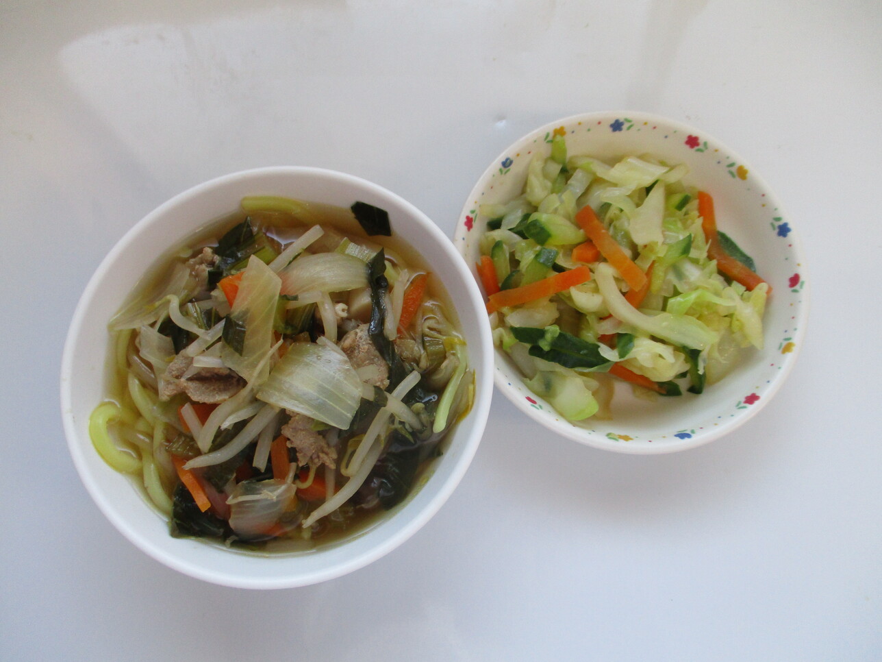 2025年12月06日 ごちそうさま 12/6(土)もやしはヘルシー!! もやしは、ほとんど水分で一袋約30キロカロリーほど。たっぷり入れてもカロリーが増えにくく、ラーメンの満足感をあげて全体のカロリーを抑えられるのが特徴です。 ☆おひる☆・もやしラーメン ・中華和え ☆おやつ☆・クラッカーサンド ・お茶