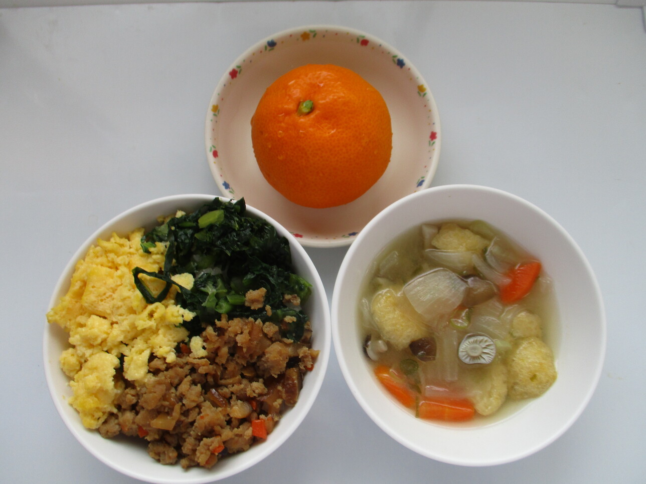 2026年01月05日 ごちそうさま 1/5(月)新年!! 明けましておめでとうございます♪今年もよろしくお願いします。2026年も安全でおいしい給食を作っていきます!! ☆おひる☆・3色ごはん ・たまねぎのみそ汁 ・みかん ☆おやつ☆・ミルク蒸しパン ・お茶