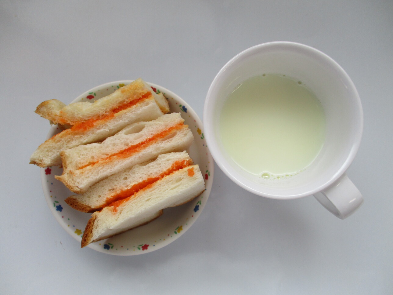 2026年01月08日 ごちそうさま 1/8(木)キャロットジャム♪ 今日のおやつはキャロットジャムサンド♪にんじんを煮て、オレンジジュースやレモン果汁を加えキャロットジャムに変身しますよ! ☆おひる☆・ごはん ・マーボー豆腐 ・ナムル ☆おやつ☆・キャロットジャムサンド ・ミルク