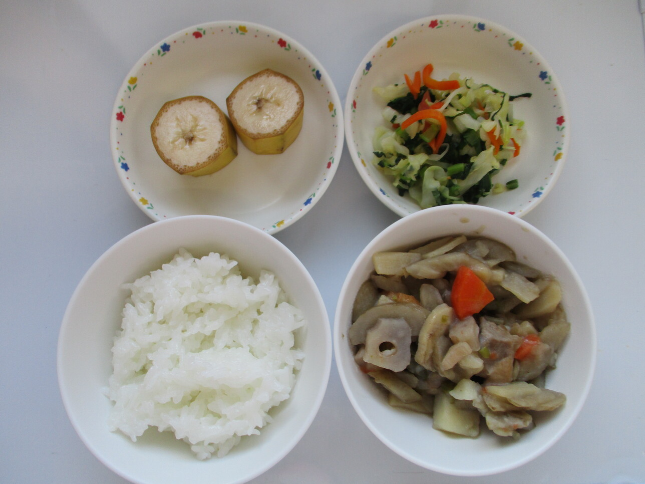 2026年01月09日 ごちそうさま 1/9(金)れんこんについて☆ れんこんは、体にこもった熱を冷まし、体を潤したり血流をよくしてくれます。皮ごとすりおろしたれんこんは、喉の痛みやせき、たんの緩和に良いと言われています。 ☆おひる☆・ごはん ・筑前煮 ・酢の物 ・バナナ ☆おやつ☆・プリン ・お茶