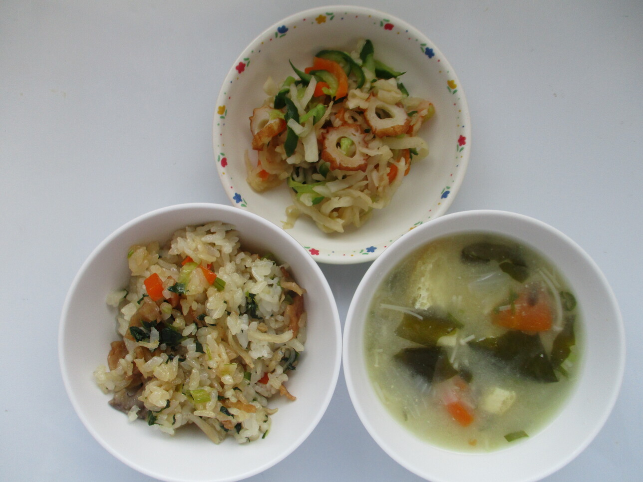 ・揚げ蓮根とじゃこのごはん ・はりはり和え ・油揚げのみそ汁