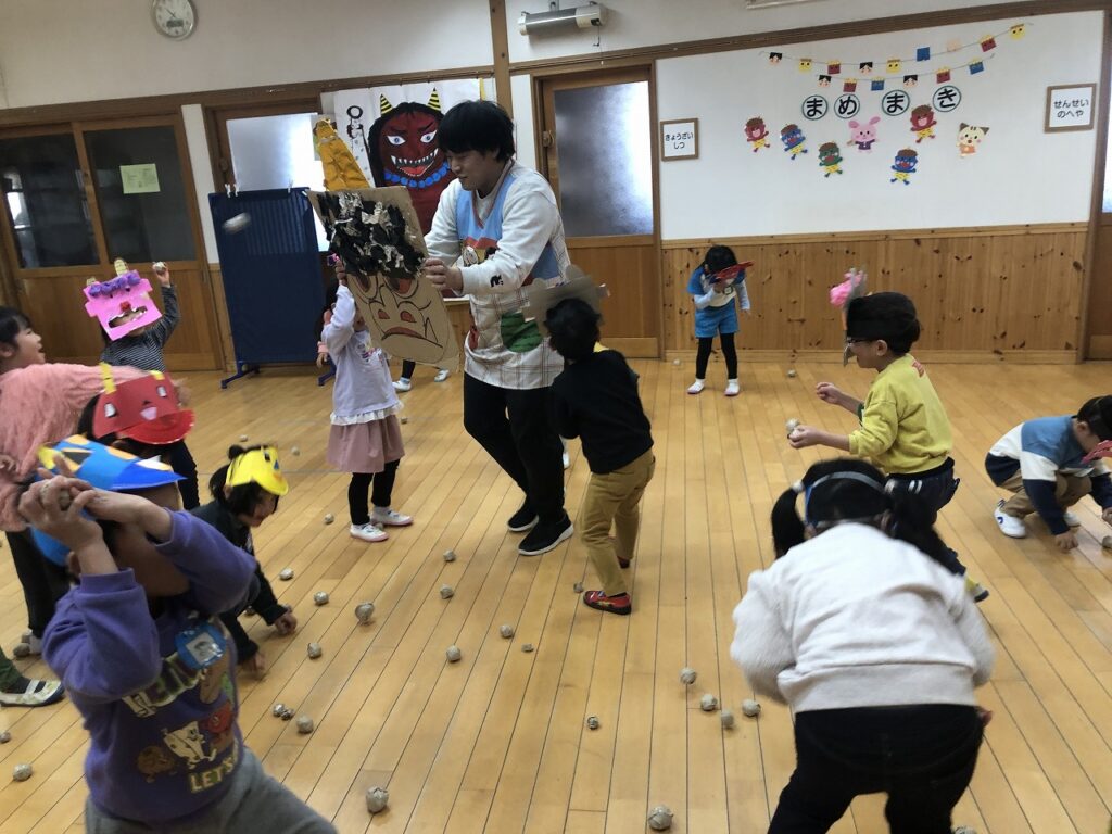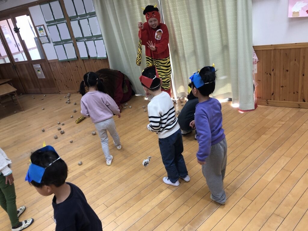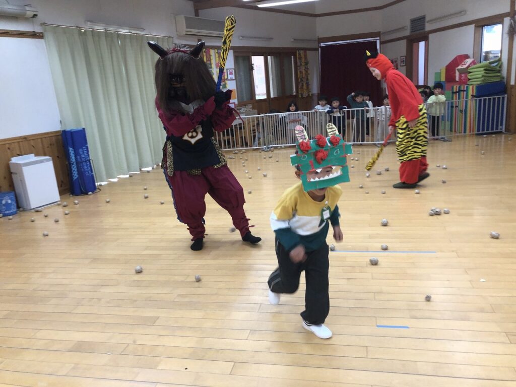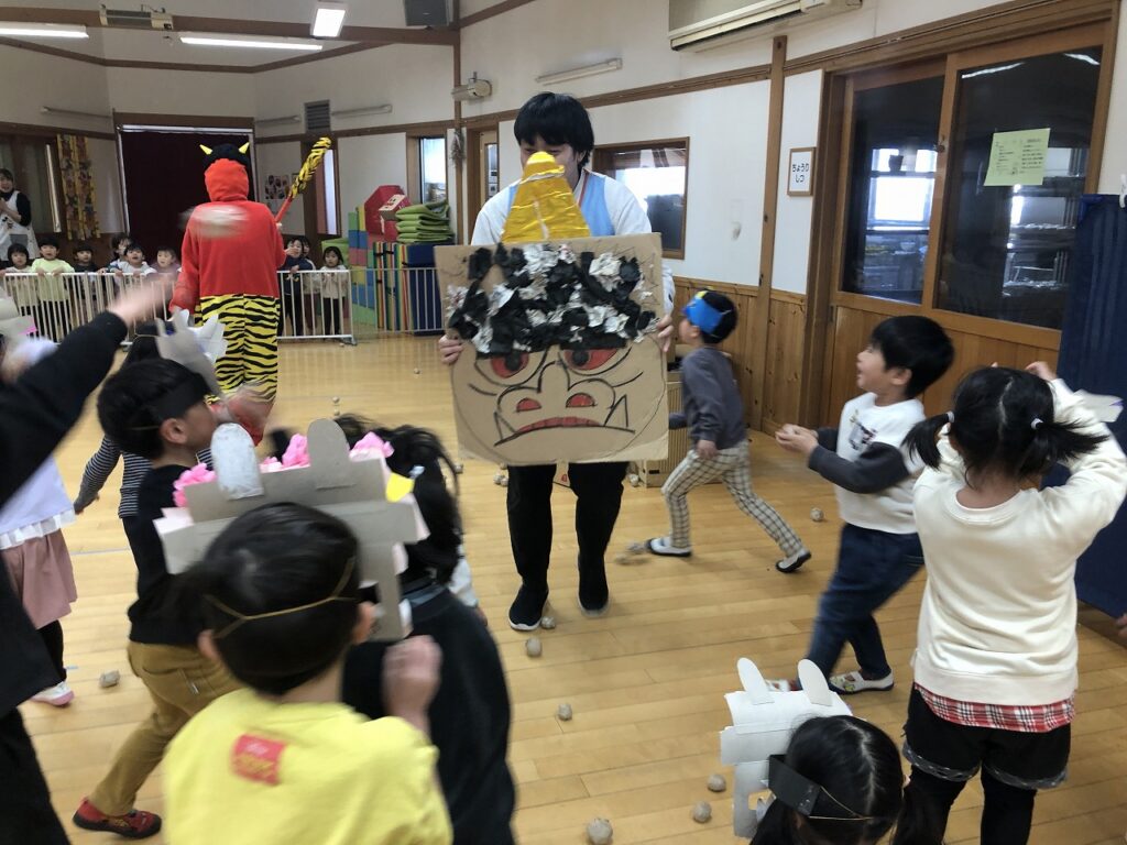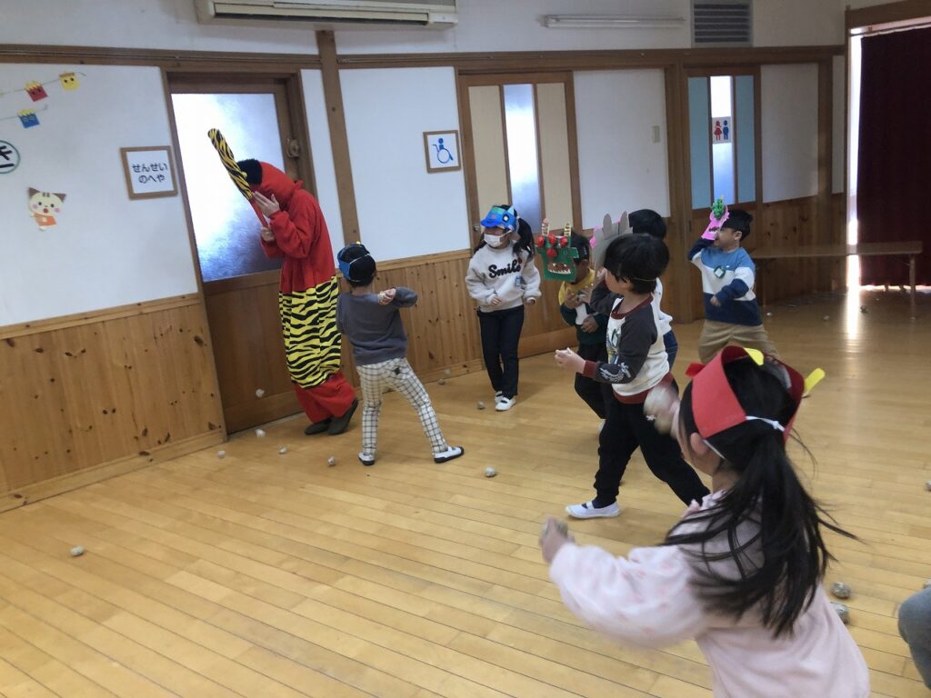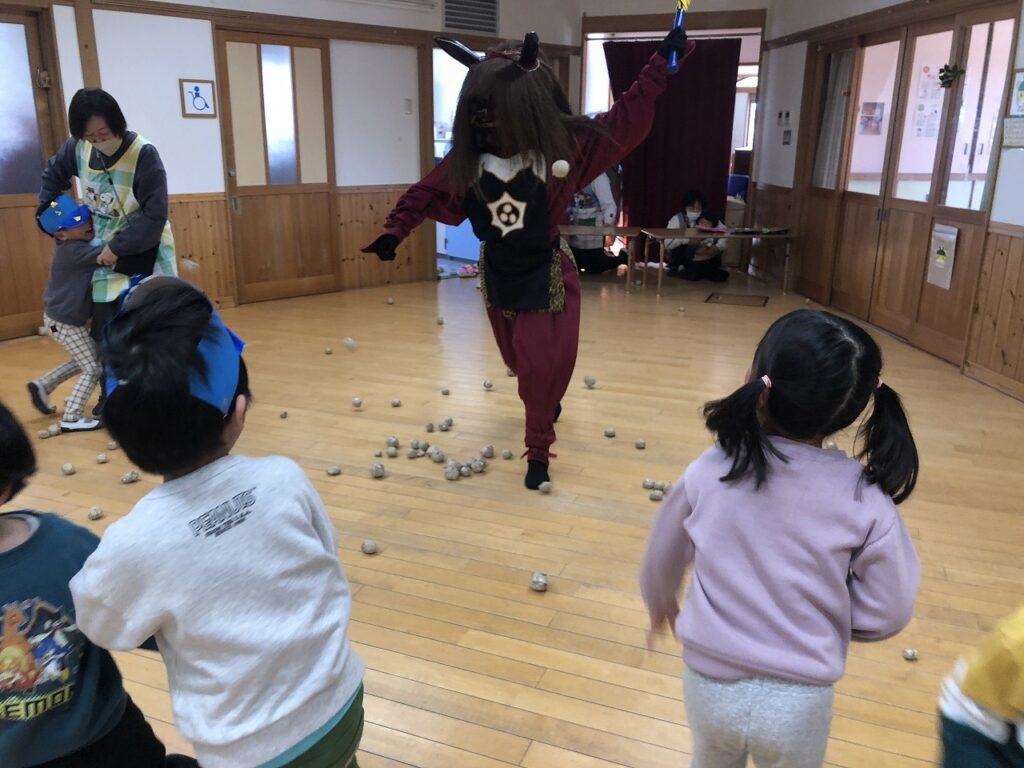 突然の大鬼の登場に固まる子どもたち、怖くて涙が出てしまう子もいれば、「鬼は外!福は内!」と勇気を振りしぼって果敢に豆を投げる子の姿もありました。