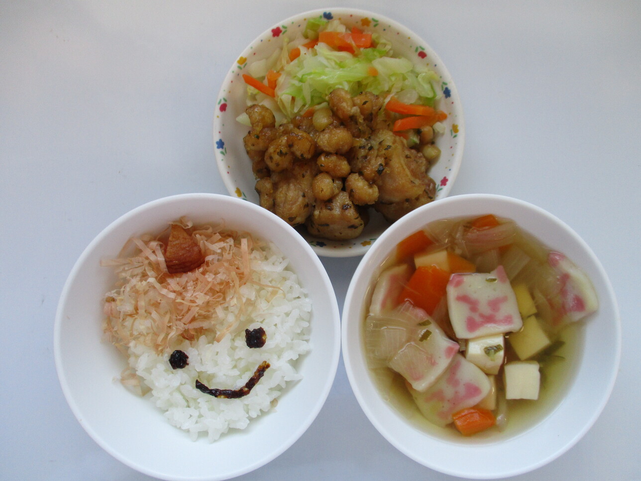 鬼ライスは、角をさつまあげ、髪はかつおぶし、顔はのり佃煮で書いて、見ても可愛い、食べてもおいしいごはんになっています♪