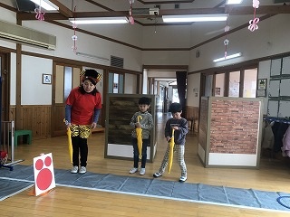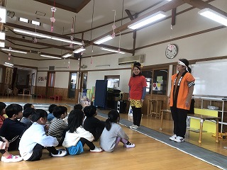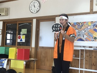 今年度最後の交通安全教室がありました。桃太郎さんが来てくれて、横断歩道の渡り方や信号機の意味、傘のさし方、しまい方を学びましたよ!