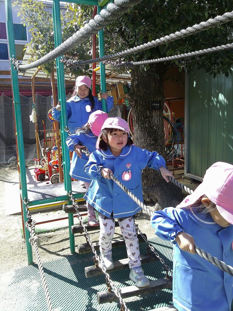 あまきこども園に到着後は、安全に楽しく遊ぶお約束をしてから、ジャングルジム・乗り物・丸太橋などの遊具でたくさん遊びました。