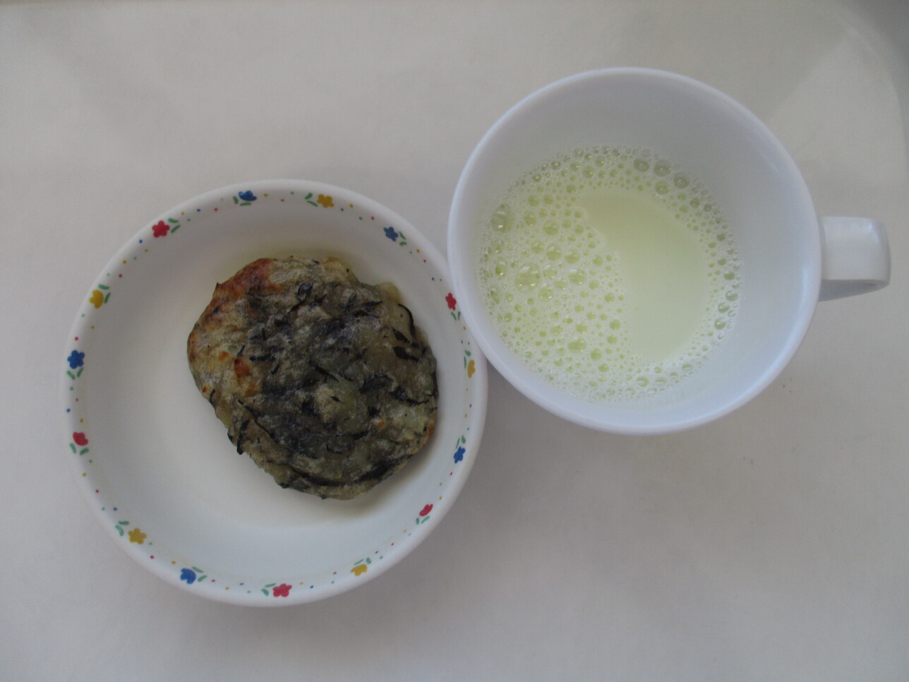 今日のおやつはひじき芋もち!!蒸したじゃがいもにひじきや片栗粉をまぜてしょうゆ・みりん・さとうで味付けをして焼きます。ひじきには骨を強くするカルシウムや腸を綺麗にする食物繊維が、たっぷり含まれています♪