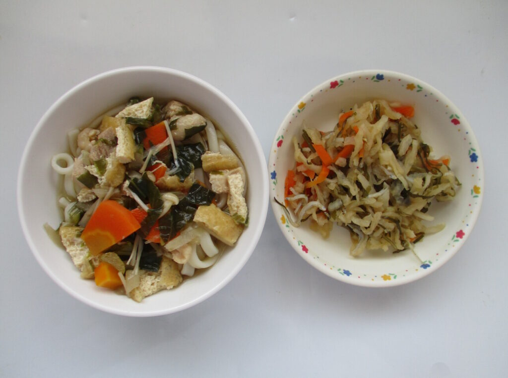 2026年04月25日 ごちそうさま 小松菜の豆知識♪ 茎が太くてしっかりとした小松菜は、シャキシャキとした歯ごたえのよい食感が楽しめます。茎が太くなりすぎると固くて食べにくいため、根本付近が適度な太さのものを選ぶようにしましょう! おひる☆ ・五目うどん・小魚入りはりはり漬け おやつ☆ ・お茶・みかんサイダーゼリー