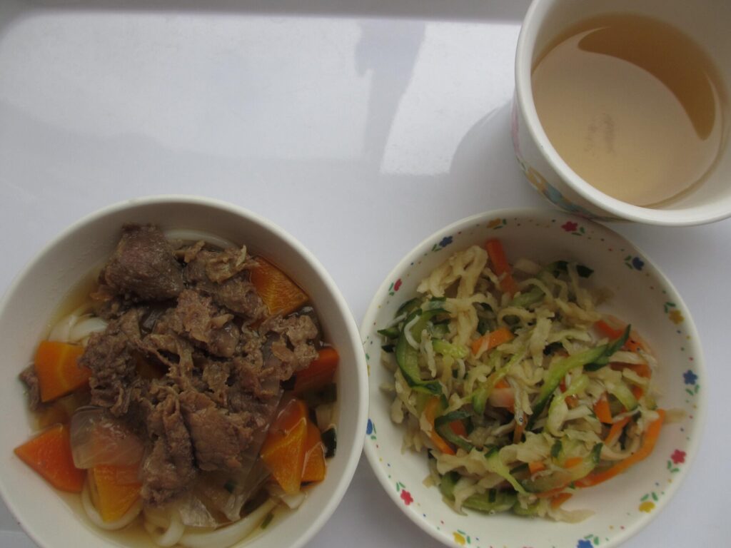 給食室から切干大根・きゅうり・人参・しらすを茹でて水気をしぼり、砂糖・しょうゆ・酢で味付けしています😊