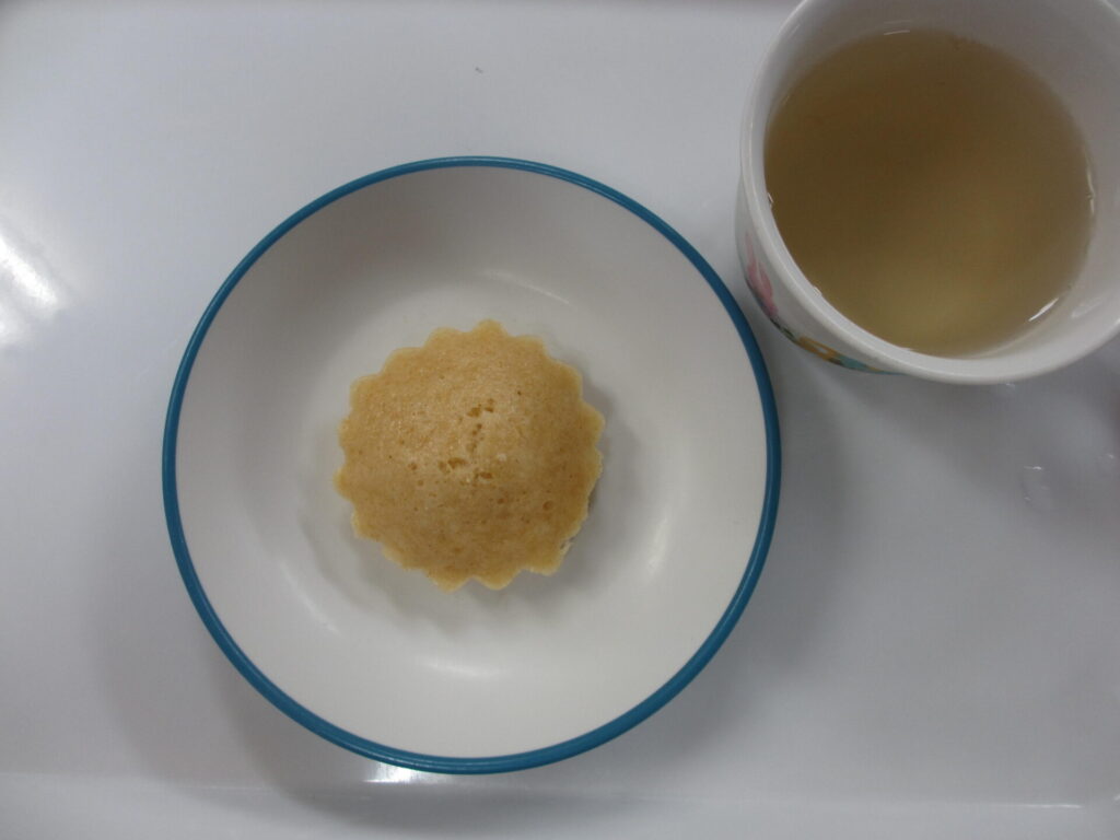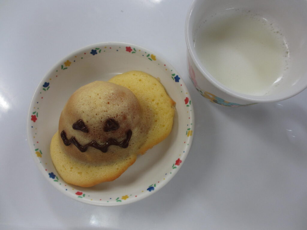 おやつのパンは、帽子パンに顔を書いておばけに見立てています!