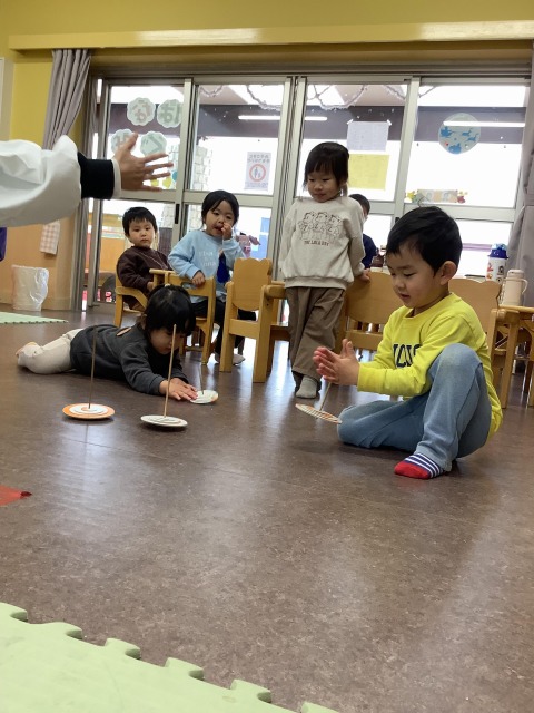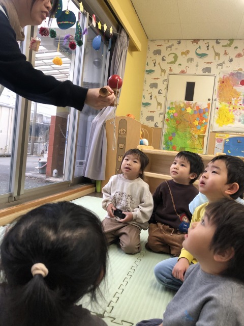 お部屋でお正月遊びを紹介すると、興味津々な子どもたち♬