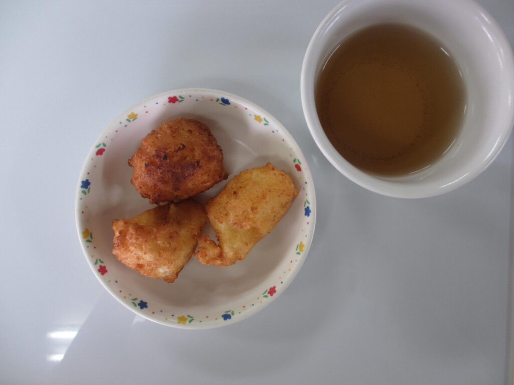 給食室から今日のおやつは、米粉と豆腐のドーナツでした!