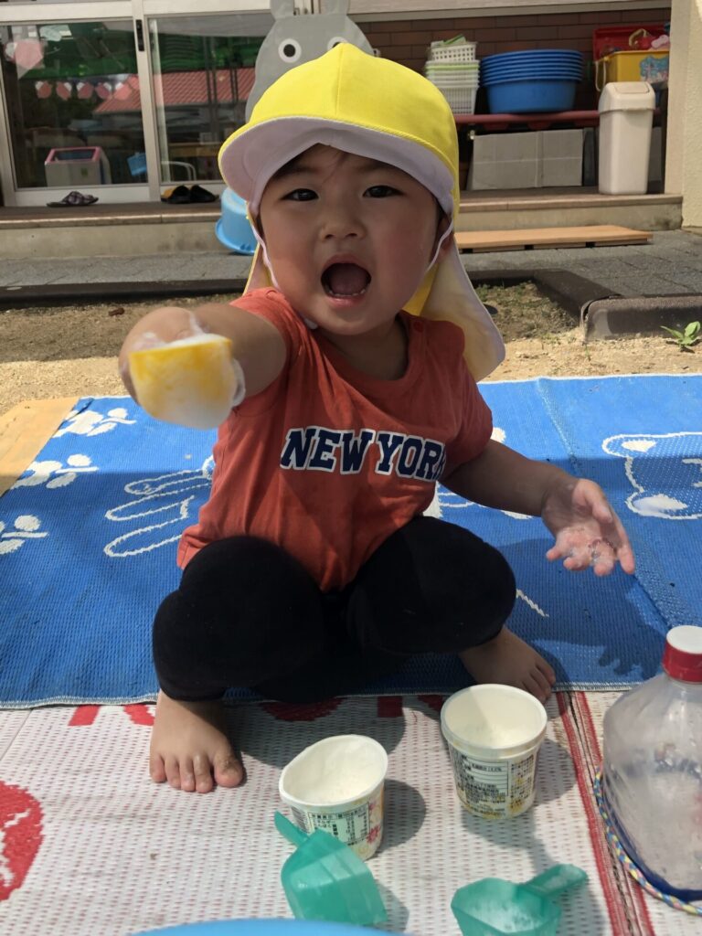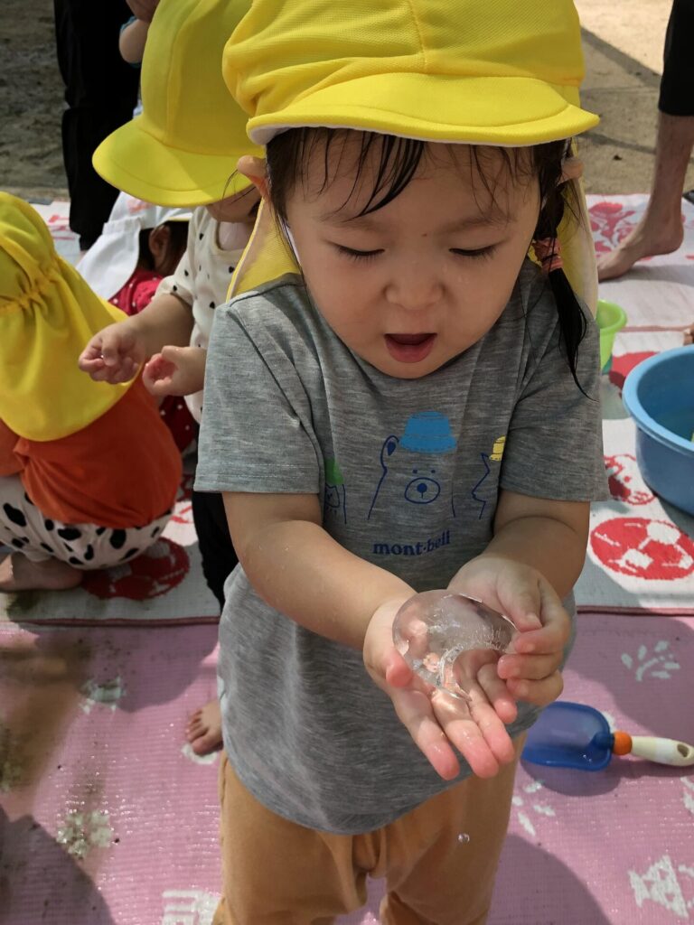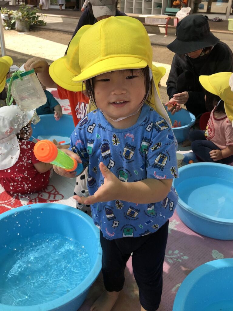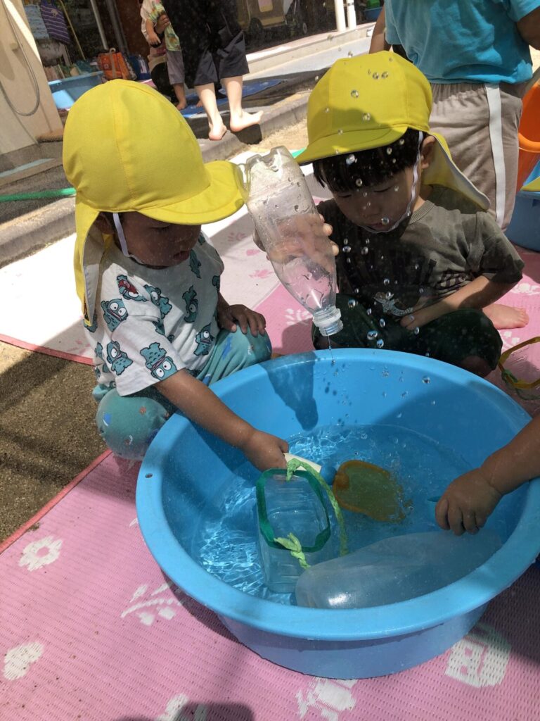 「つめたい!」「お水いれて~!」と、水遊びが大好きなつき組さん♬