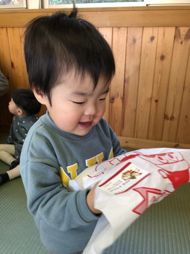 プレゼントをもらってにこにこ!開けるのがとっても楽しみだね😊