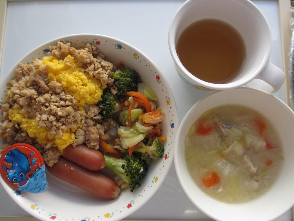鶏ひき肉とそぼろ卵で、鬼のパンツの模様をイメージしてみました!