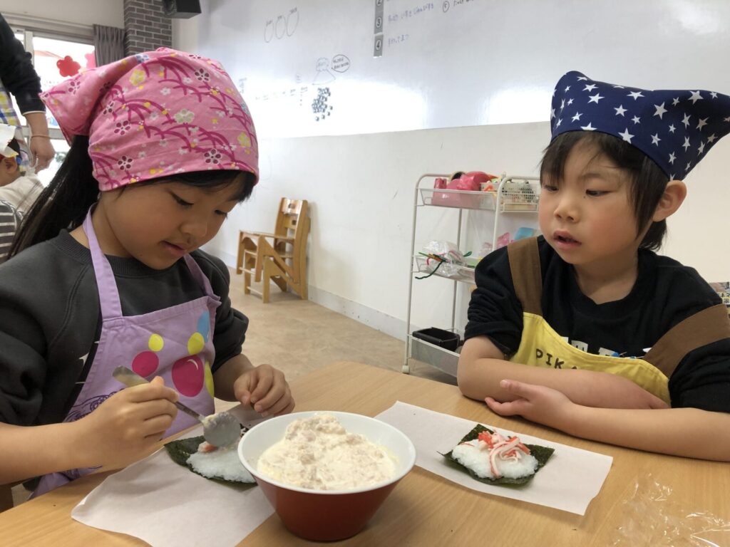 具は、大好きなツナとカニカマときゅうり!「おいしそう~!早く食べた~い!」と言いながらも、「これから巻くから、ちゃんと巻けるように置かないとね!」と巻く事を考えて細長く具を置いている姿がありましたよ!