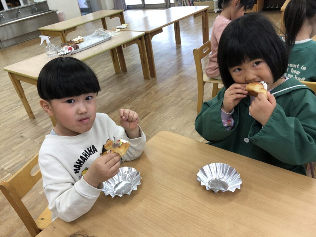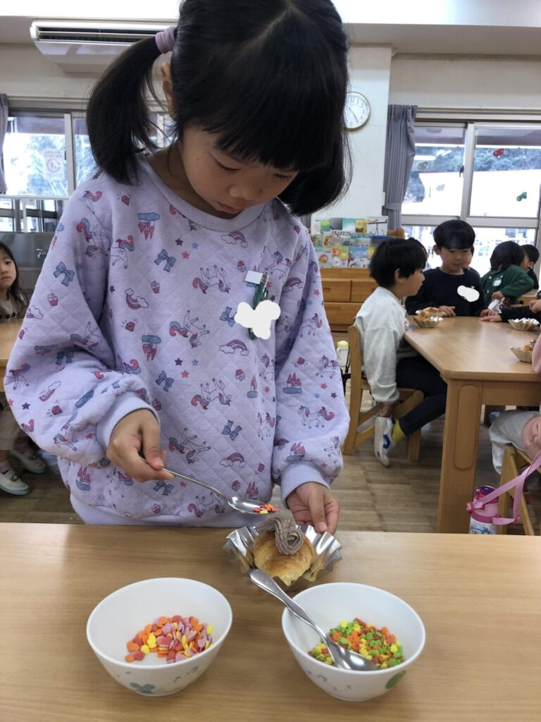 自分たちで生クリームかチョコクリーム、カラースプレーをトッピングして