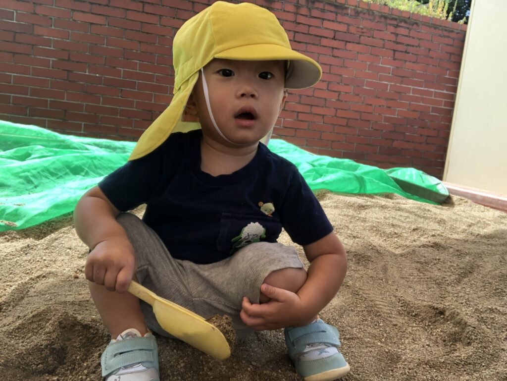 保育室からつき組(1歳児)のお友達が、砂場で遊んでいるよ!