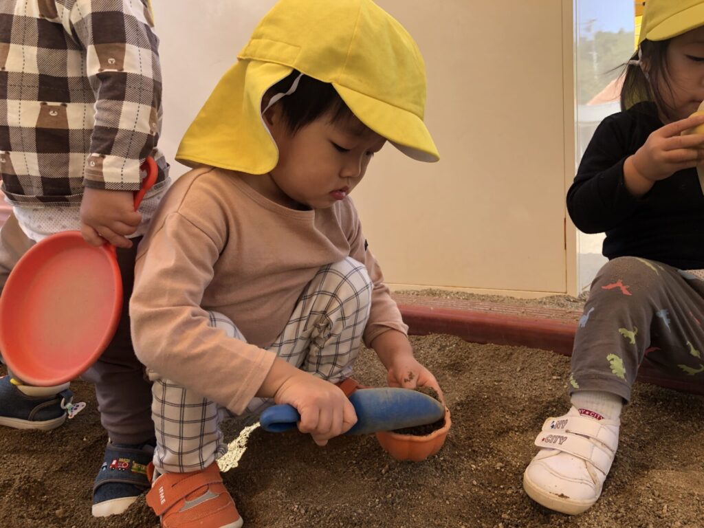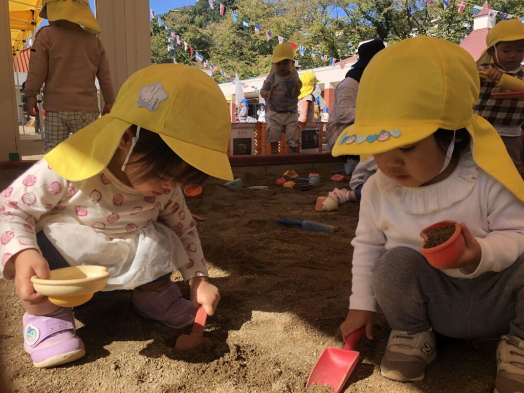 つき組(1歳児)のお友達が、砂場で遊んでいるよ!