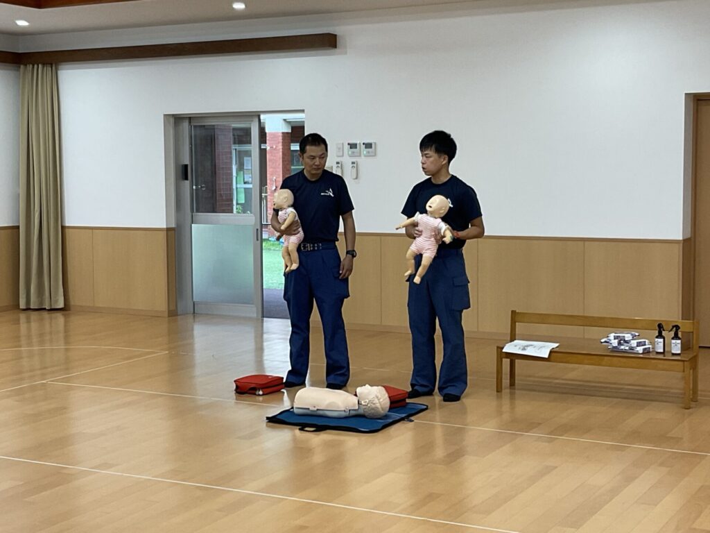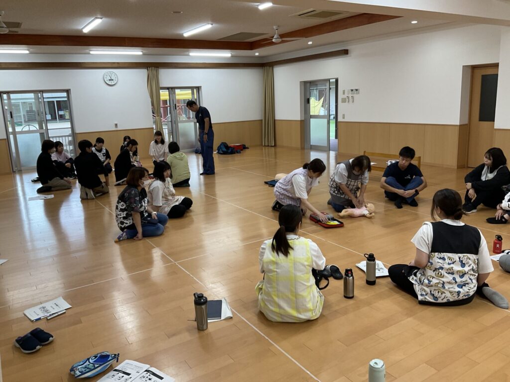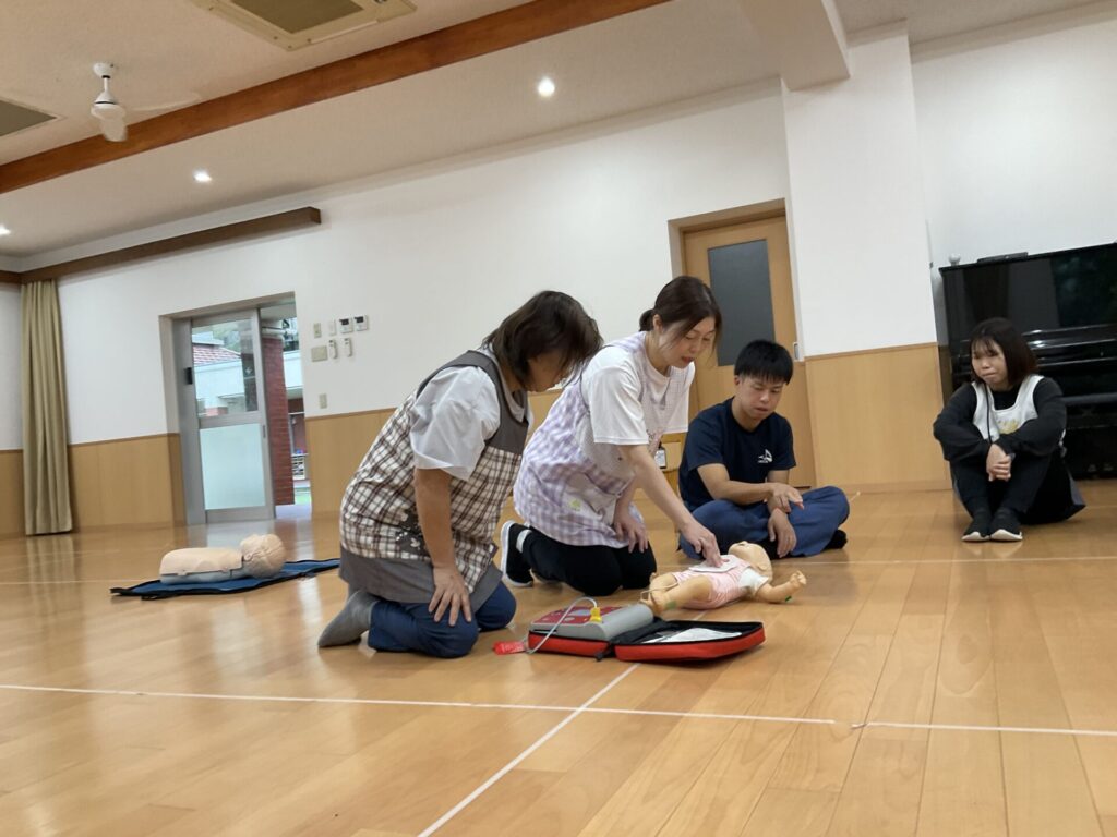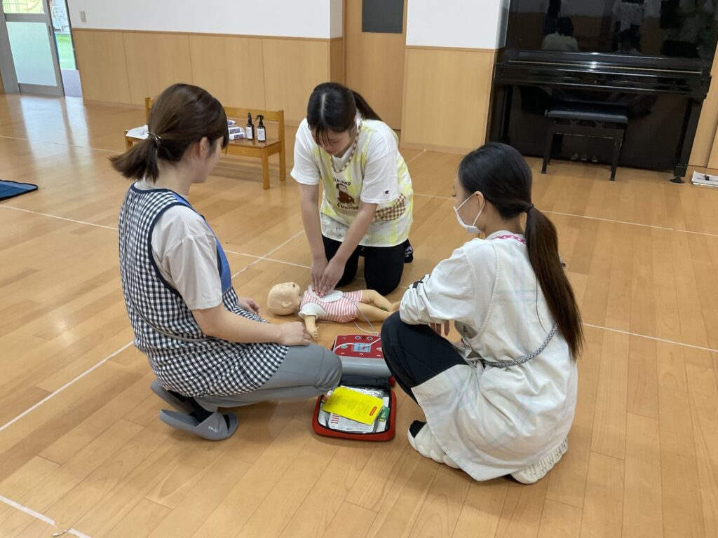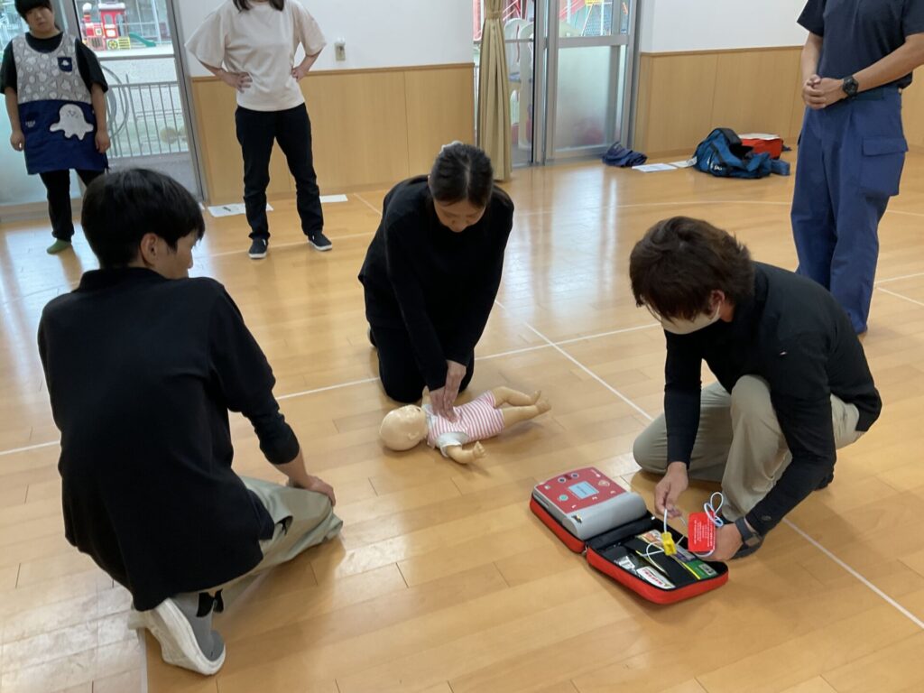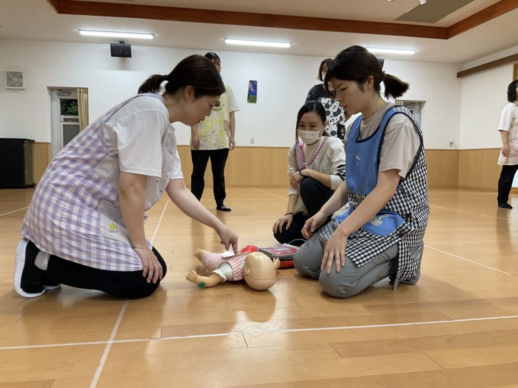 心肺蘇生法、AEDの使用方法、食べ物が詰まった時(誤飲)の対応方法を教えていただきました。