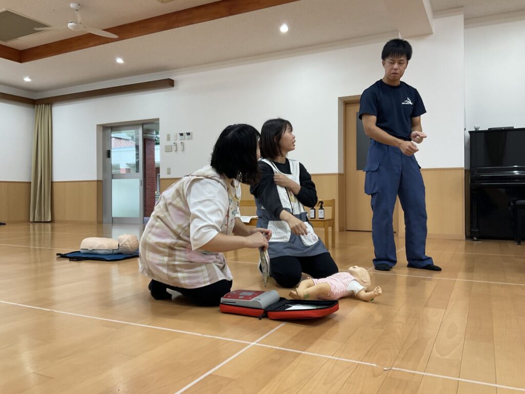 先日、消防士さんたちが保育園に来てくださり、保育士全員が救命講習を受けました!