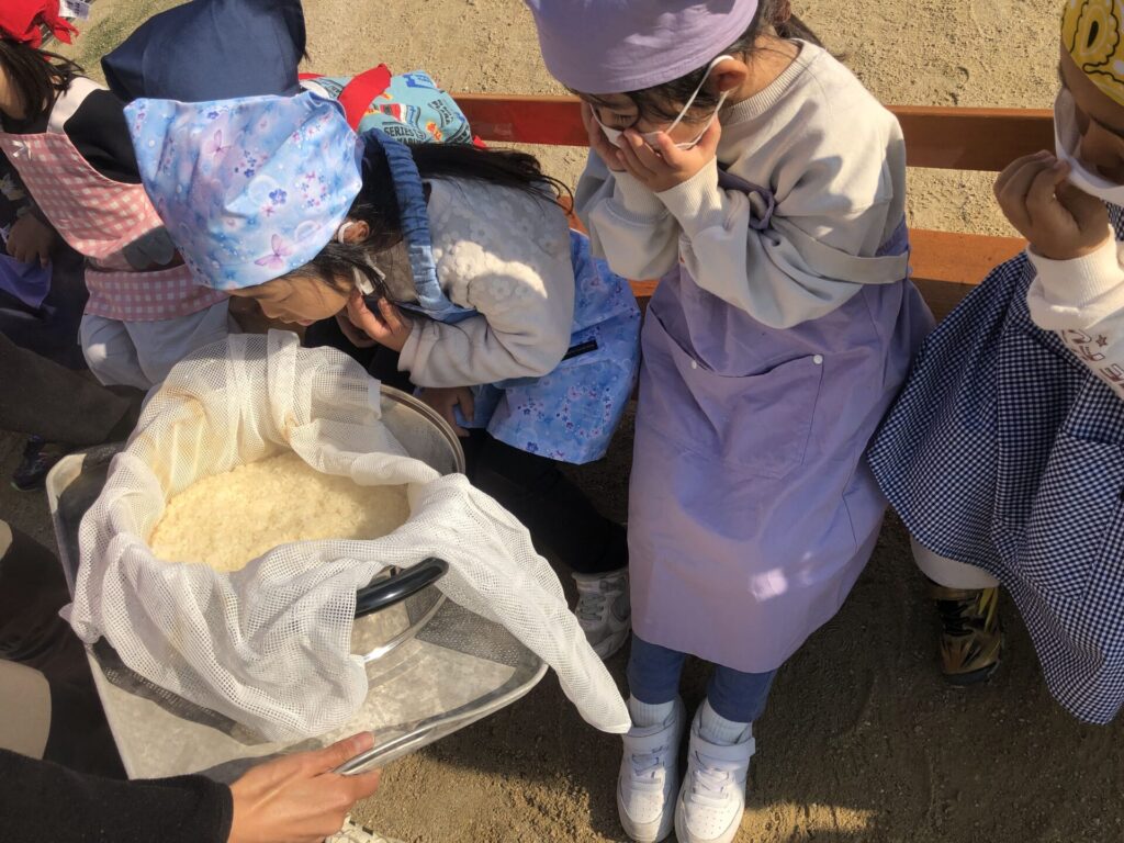 お餅に関するクイズをして親しみを持ったり、実際にもち米をみたり匂いを嗅いだりした子どもたち。