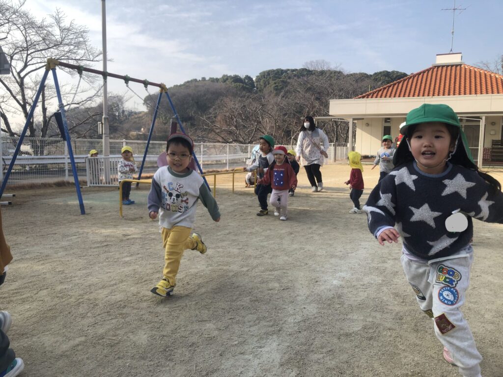 元気いっぱいに園庭を走るつき・ゆき・かぜ組のお友だち🏃