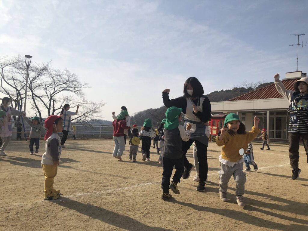 今日はつき・ゆき・かぜ組のお友だちで園庭をマラソンしたり、ダンスを踊ったりしました。