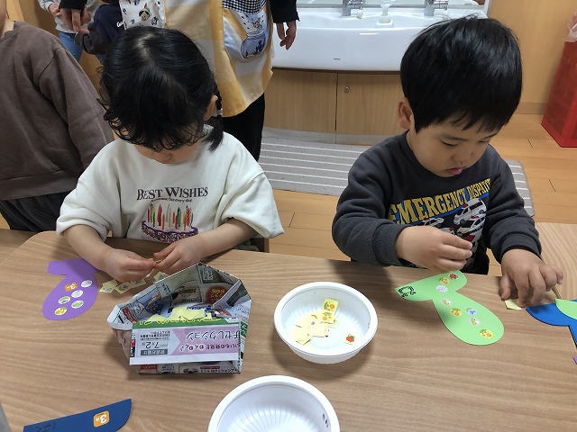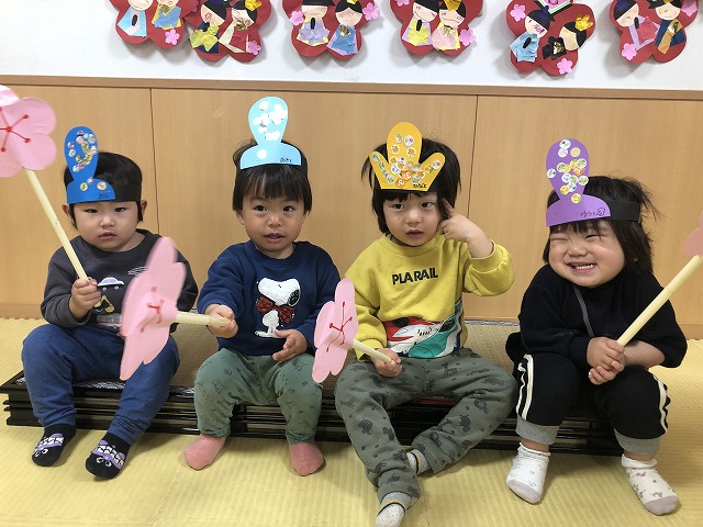 1、2歳児の部屋を開放して過ごしました。みんなで♬ダンスを踊った後は、1歳児の部屋でおひな様の段ボール玉入れ、2歳児の部屋では冠にシール貼りをし、フォトスポットで